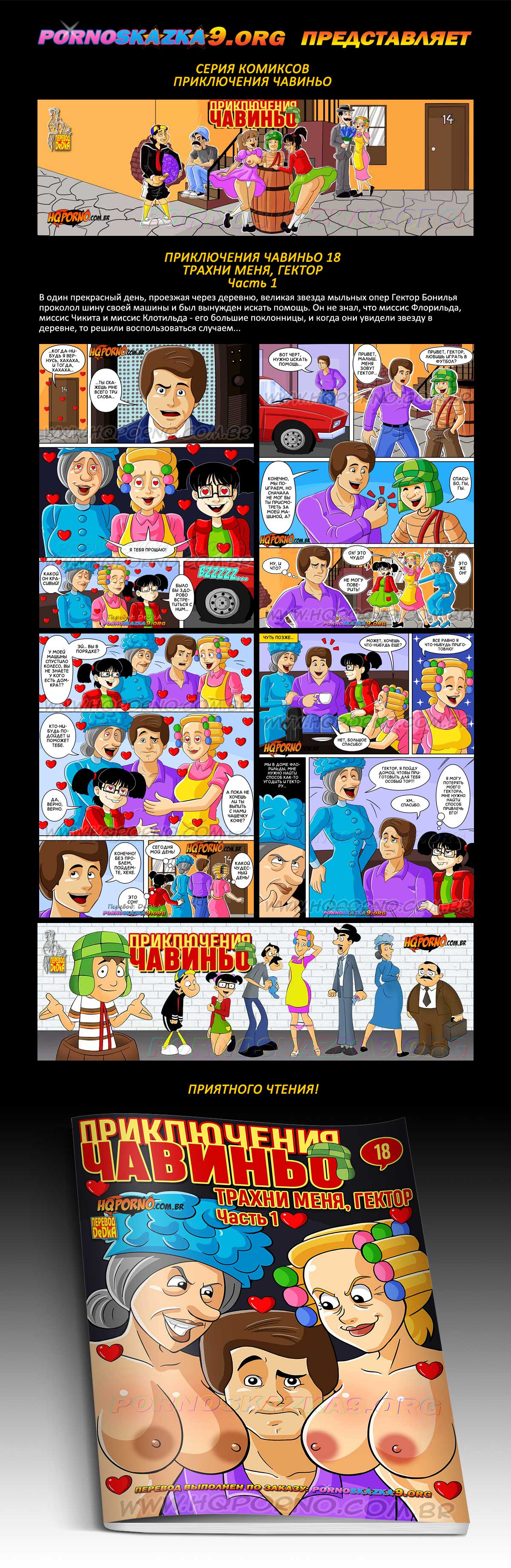 Порно комикс «Приключения Чавиньо. Часть 18. Трахни меня, Гектор. Часть 1.» В один прекрасный день, проезжая через деревню, великая звезда мыльных опер Гектор Бонилья проколол шину своей машины и был вынужден искать помощь. Он не знал, что миссис Флорильда, миссис Чикита и миссис Клотильда — его большие поклонницы, и когда они увидели звезду в деревне, то решили воспользоваться случаем…